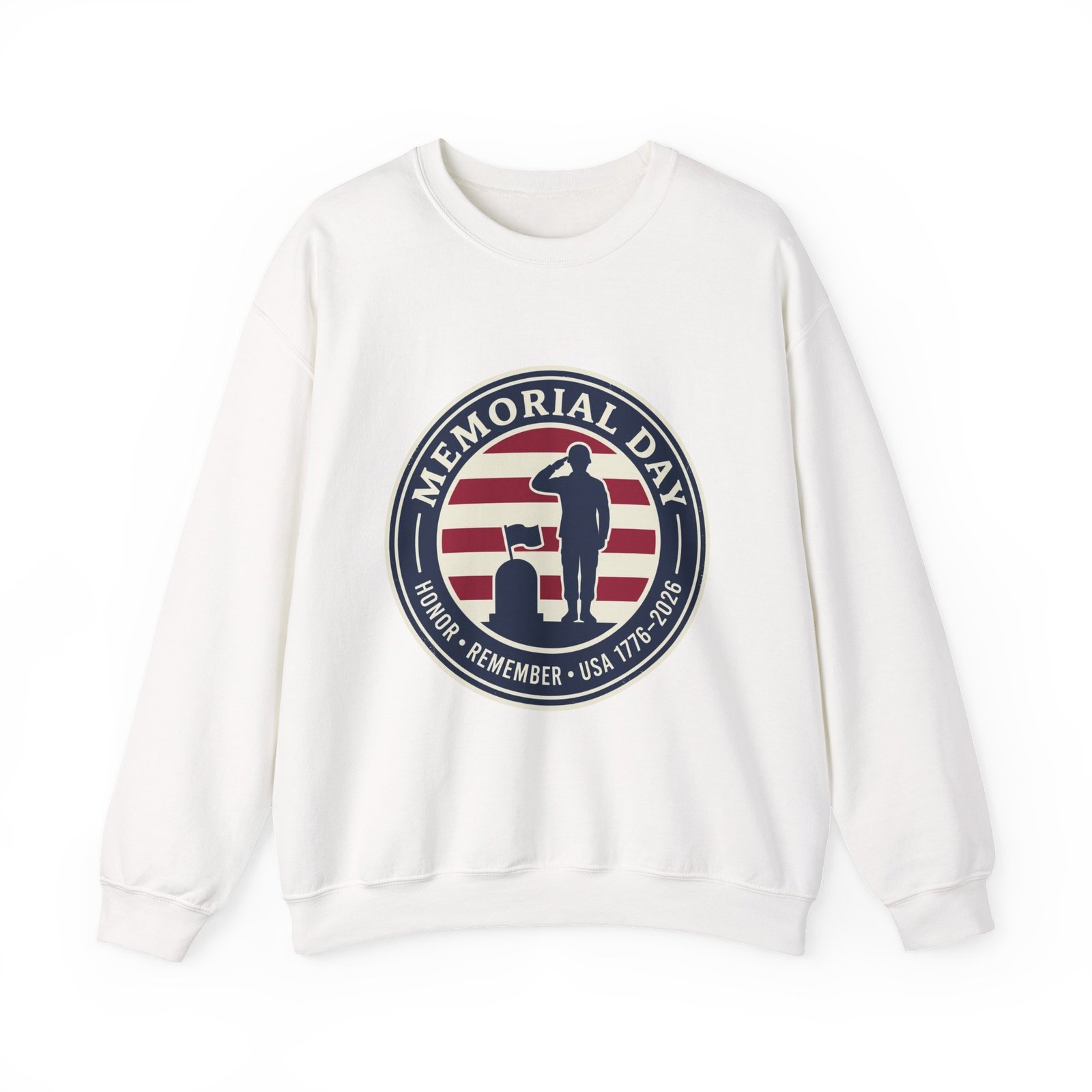 A commemorative round kiss-cut sticker honoring Memorial Day and the USA 250 milestone with a vintage-distressed Americana look. The design shows a silhouetted service member saluting at a flag-draped grave marker against red-and-off-white stripes, framed by a navy ring with bold date and remembrance text (USA 1776–2026). Subdued crimson, navy, and off-white tones give a heritage feel that reads both reflective and proudly patriotic—an understated emblem to mark the 250th anniversary and Memorial Day observances.
